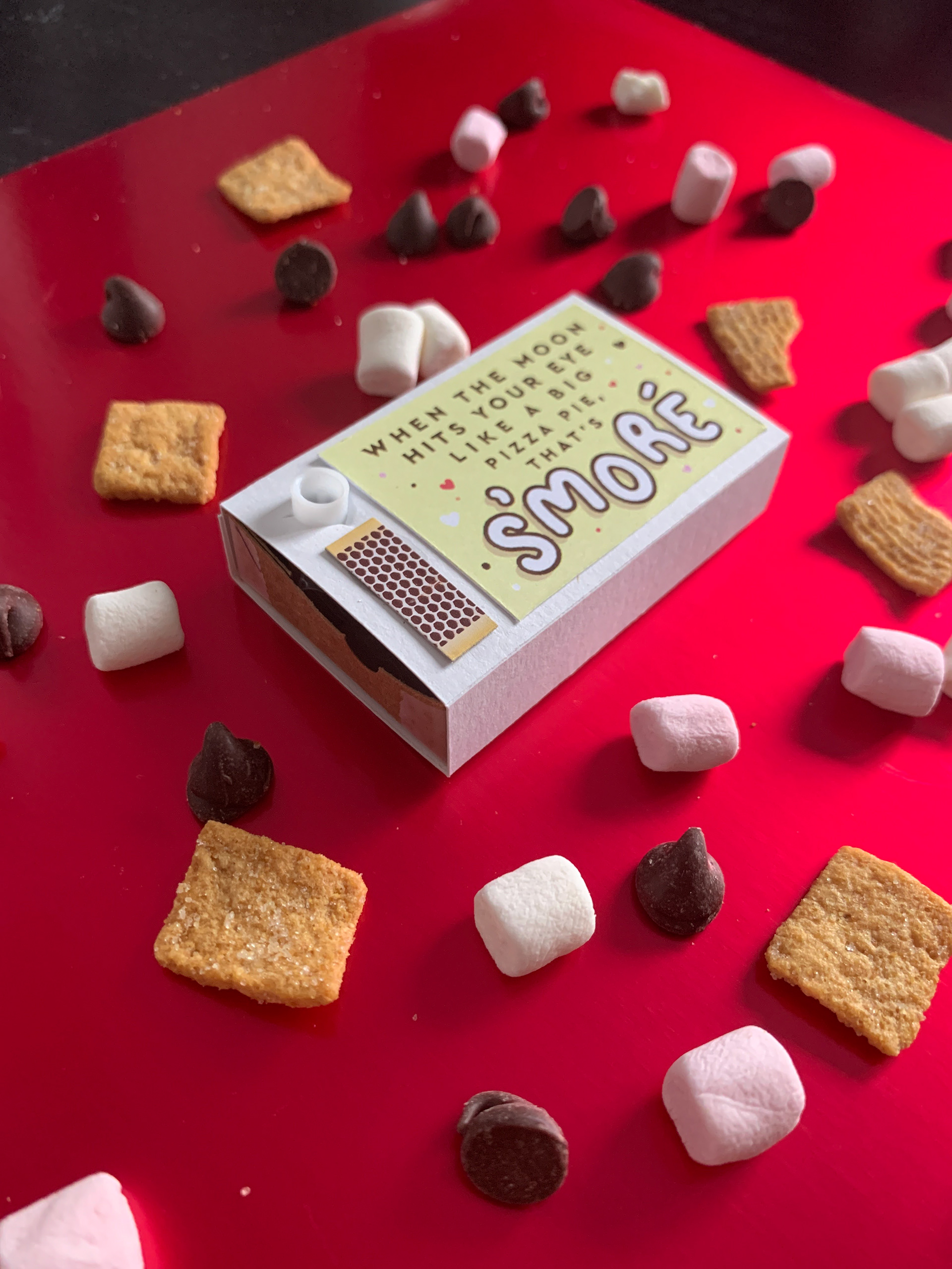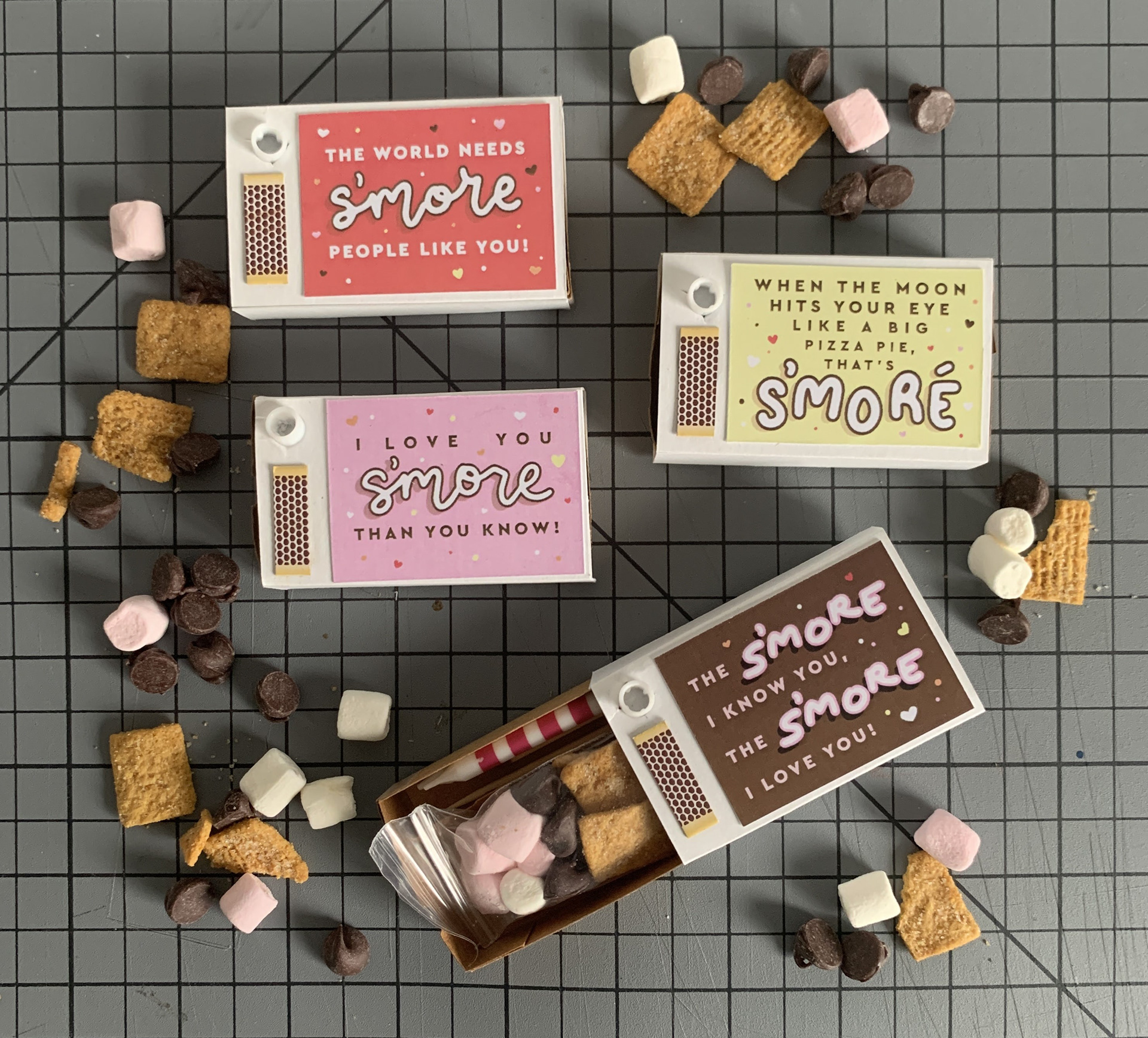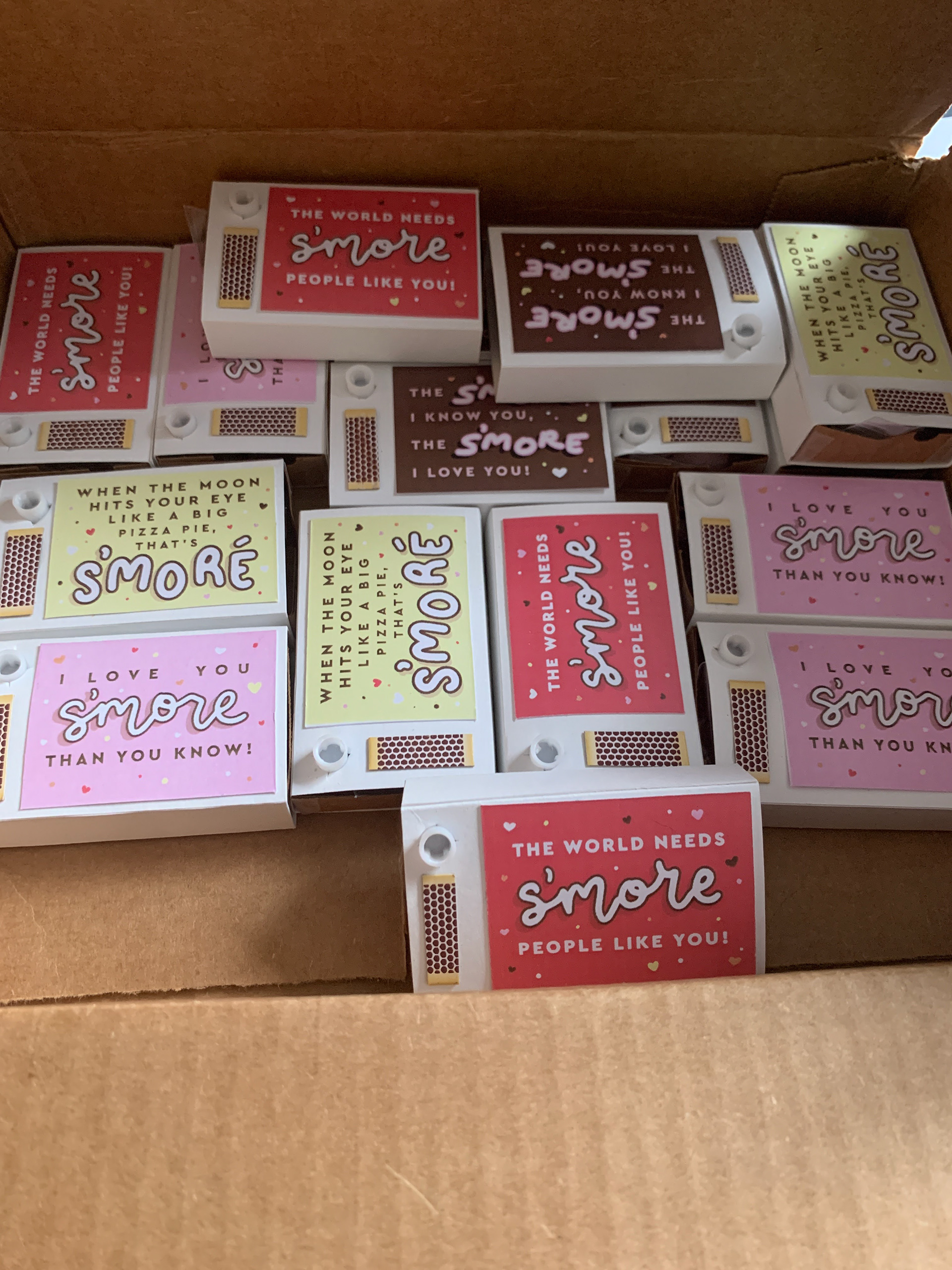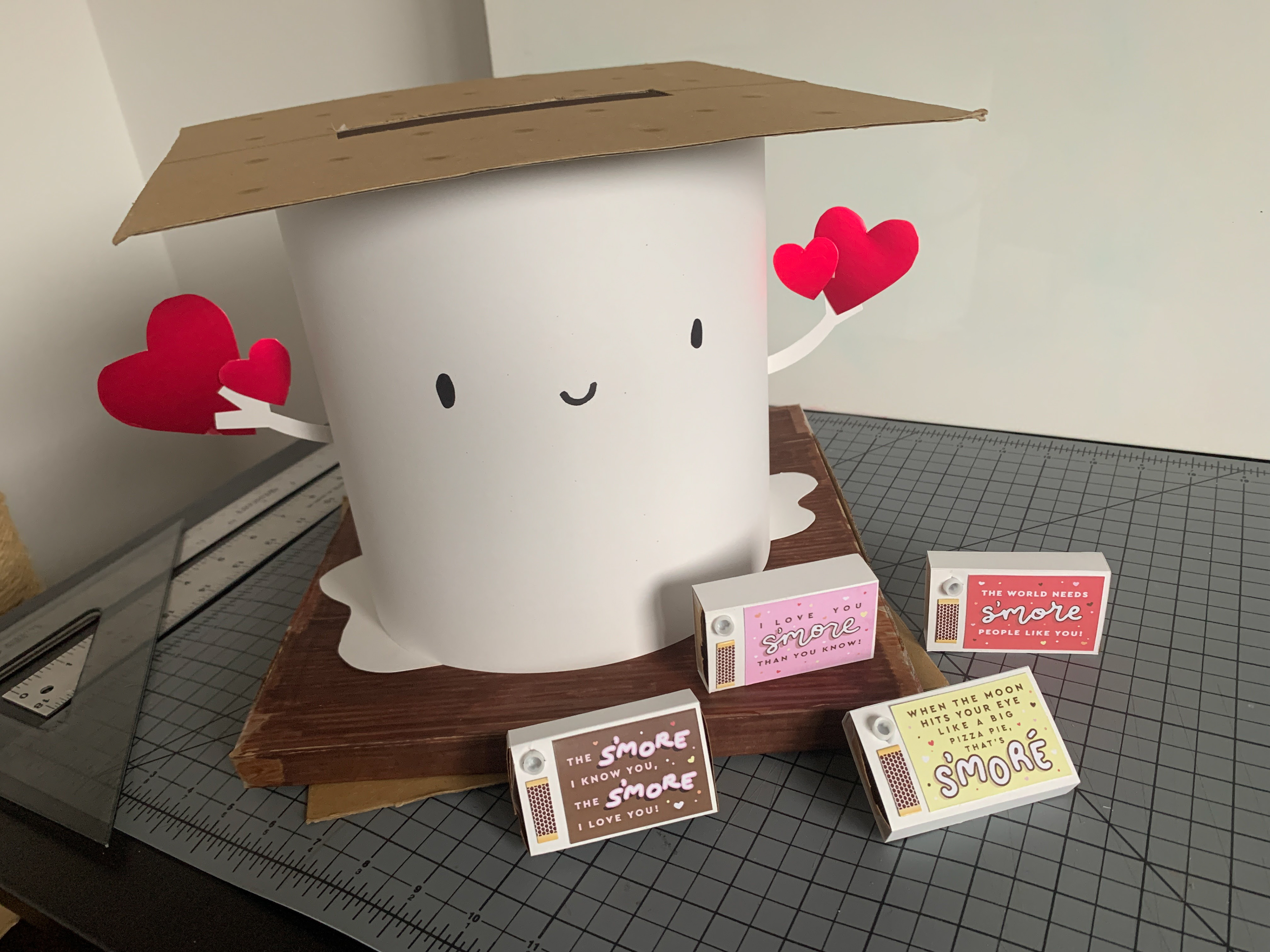 I designed and hand-lettered the fun S'mores-puns on the tops of the boxes. There were four designs in all - had to have some variety, just like normal children's Valentines cards. I also made a large S'more Valentines box to go with it of course!