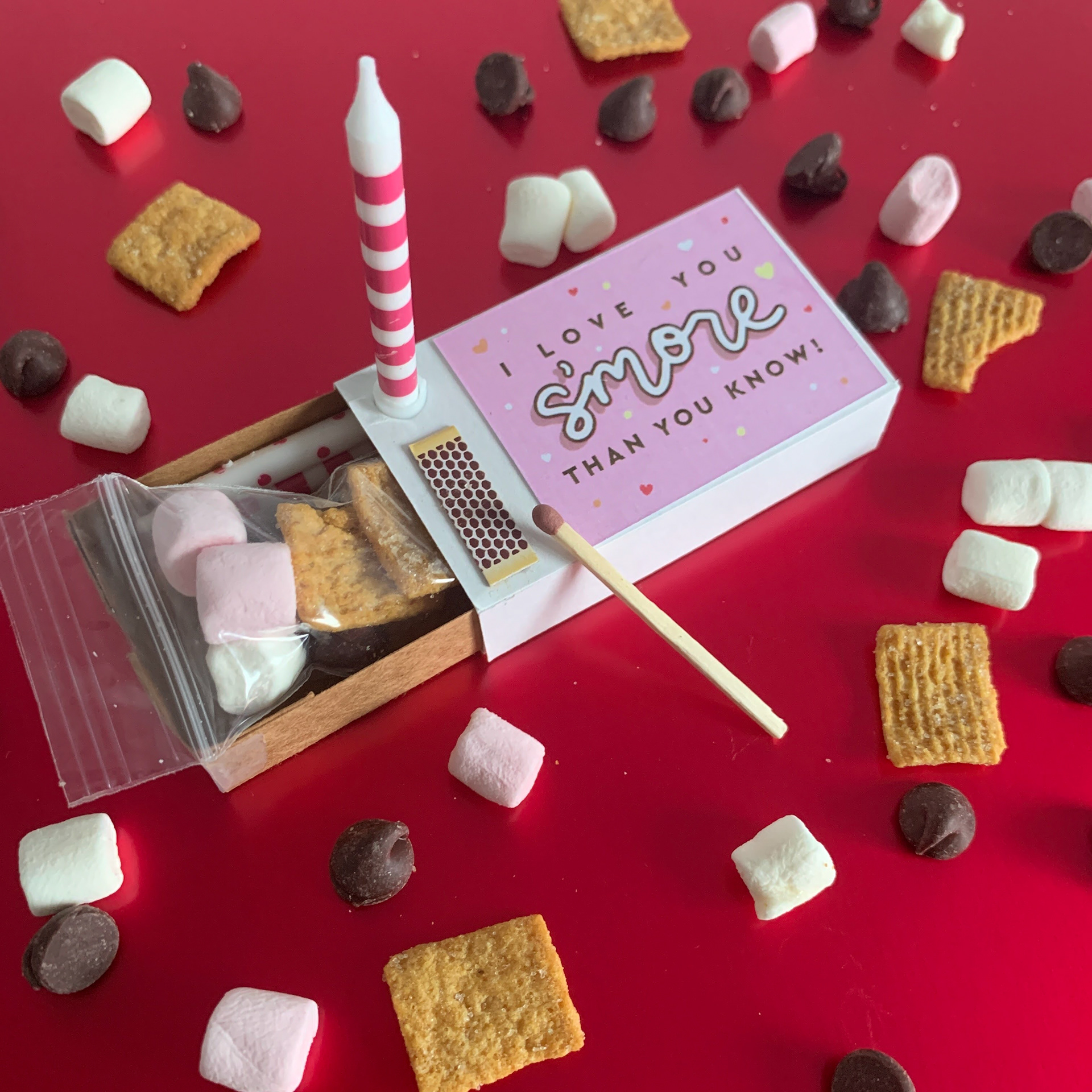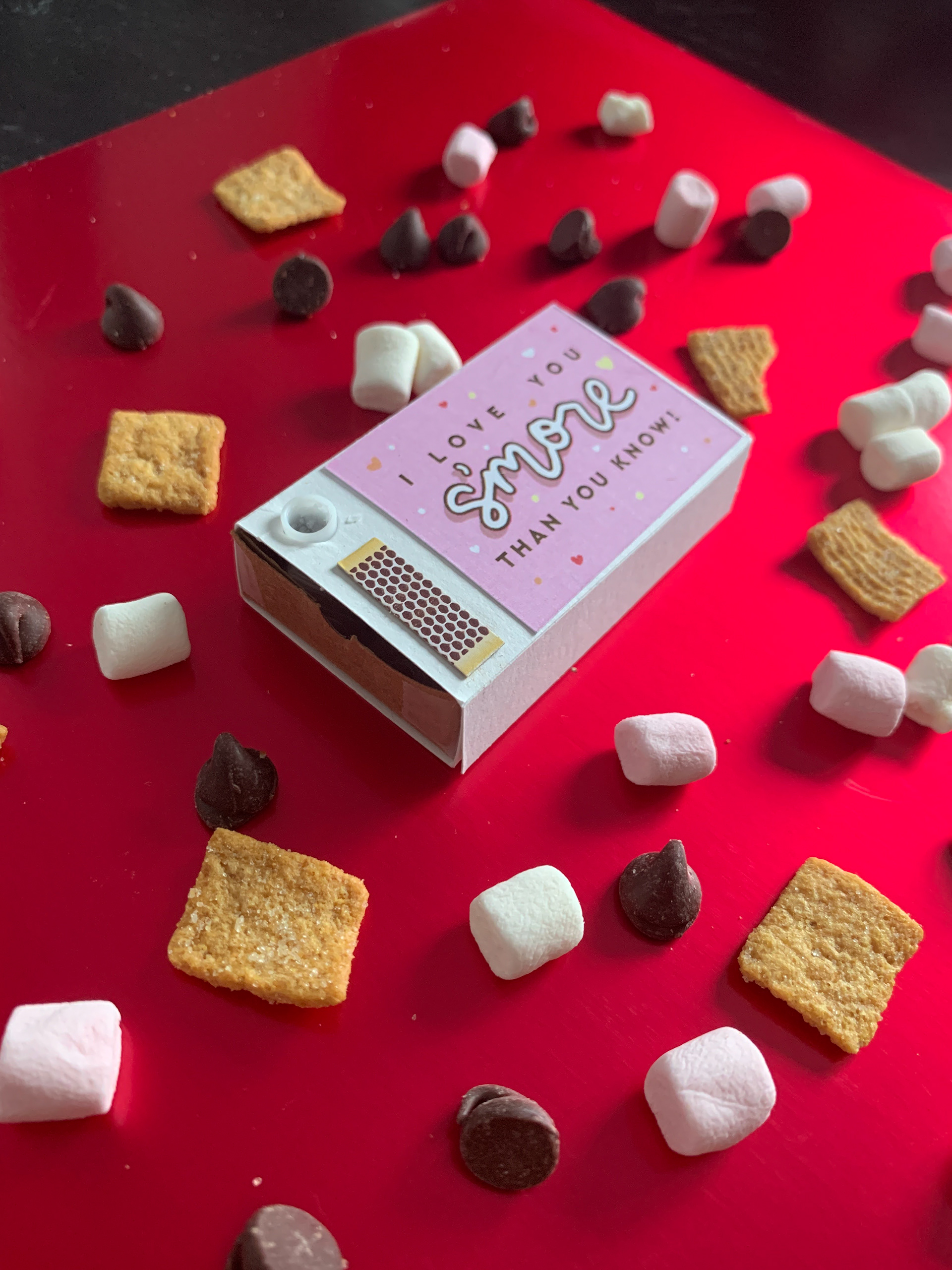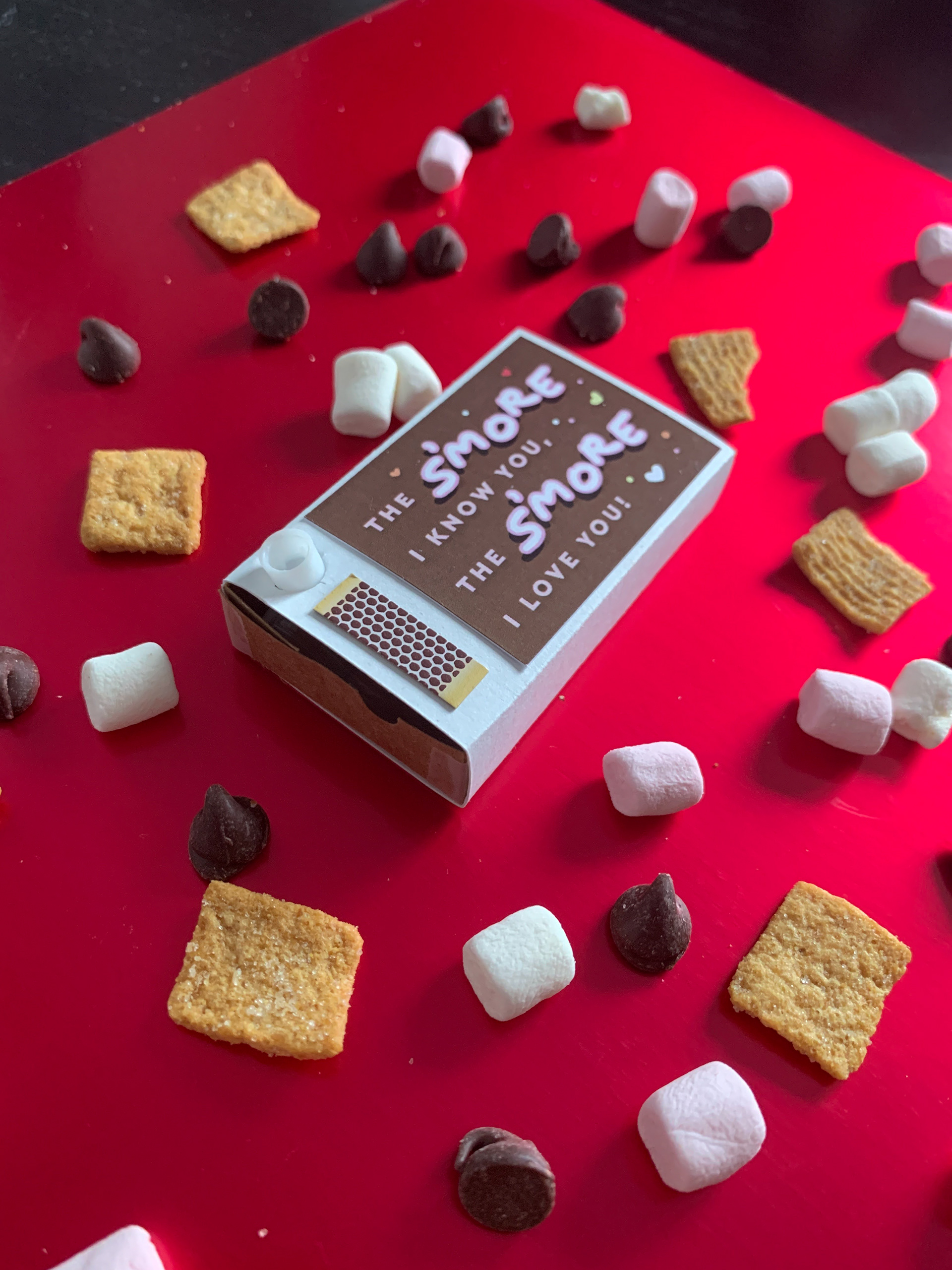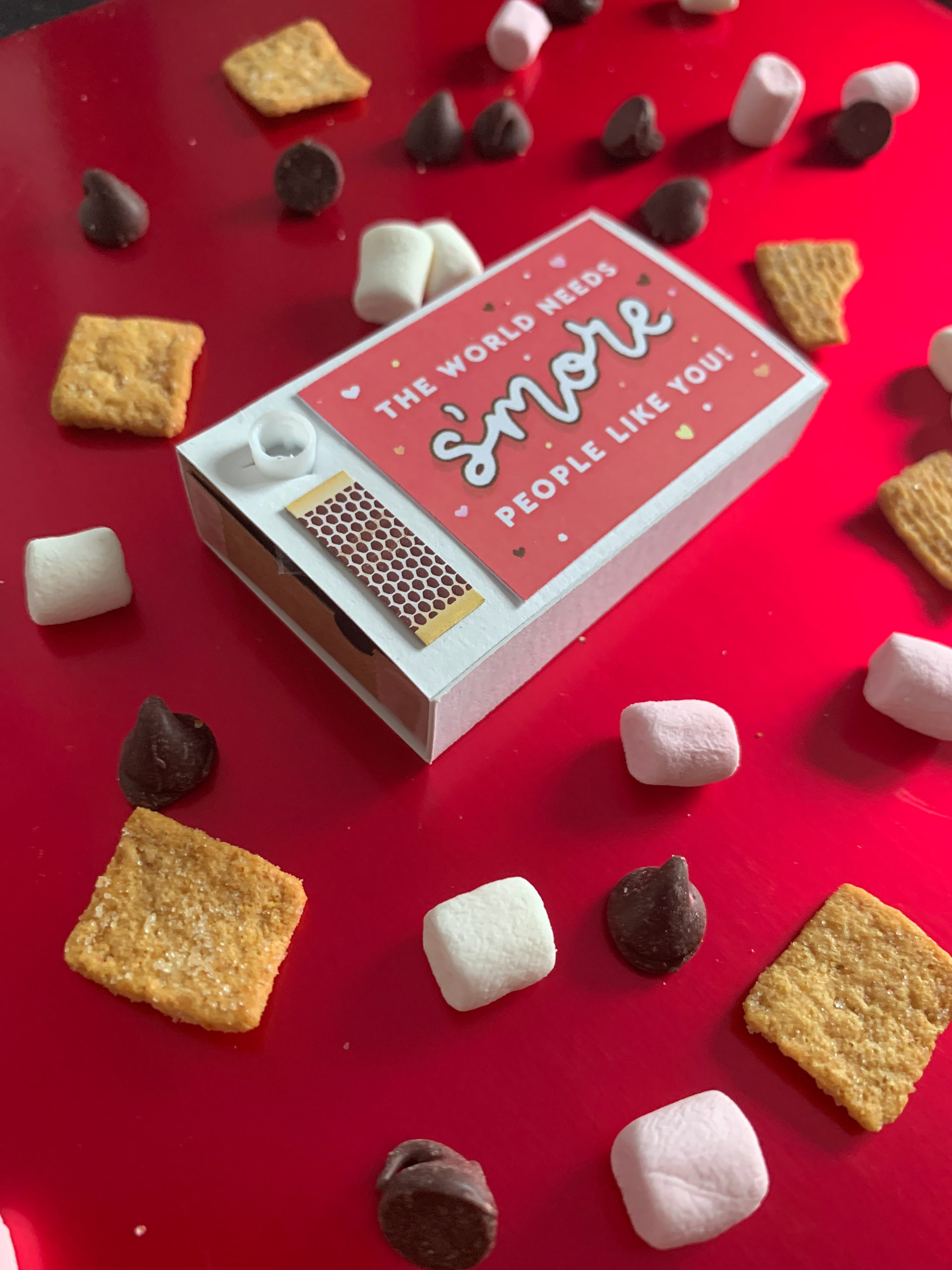 I designed and hand-lettered the fun S'mores-puns on the tops of the boxes. There were four designs in all - had to have some variety, just like normal children's Valentines cards. I also made a large S'more Valentines box to go with it of course!